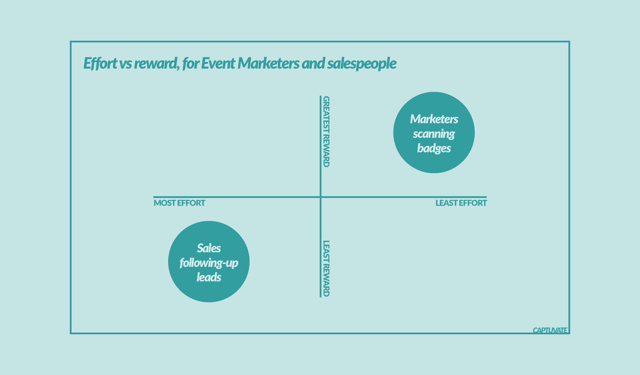 When this approach to capturing leads is used, let’s compare the efforts exerted versus the rewards gained for both the booth staffer and the salesperson: